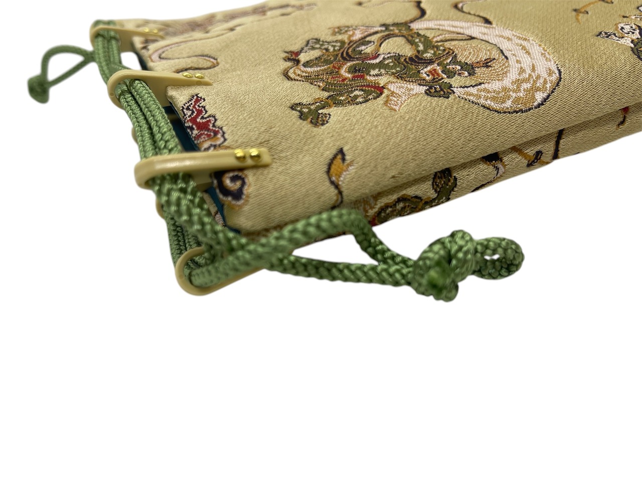 風神雷神図の織り柄と独特のデザインが、和装はもちろん、洋装にもマッチするため、お好みのスタイルでお楽しみいただけるスタイルとなっています。この特別な合切手提げミニで、日々のコーディネートに風雅さを取り入れてみてはいかがでしょうか。是非、ご愛用下さい。