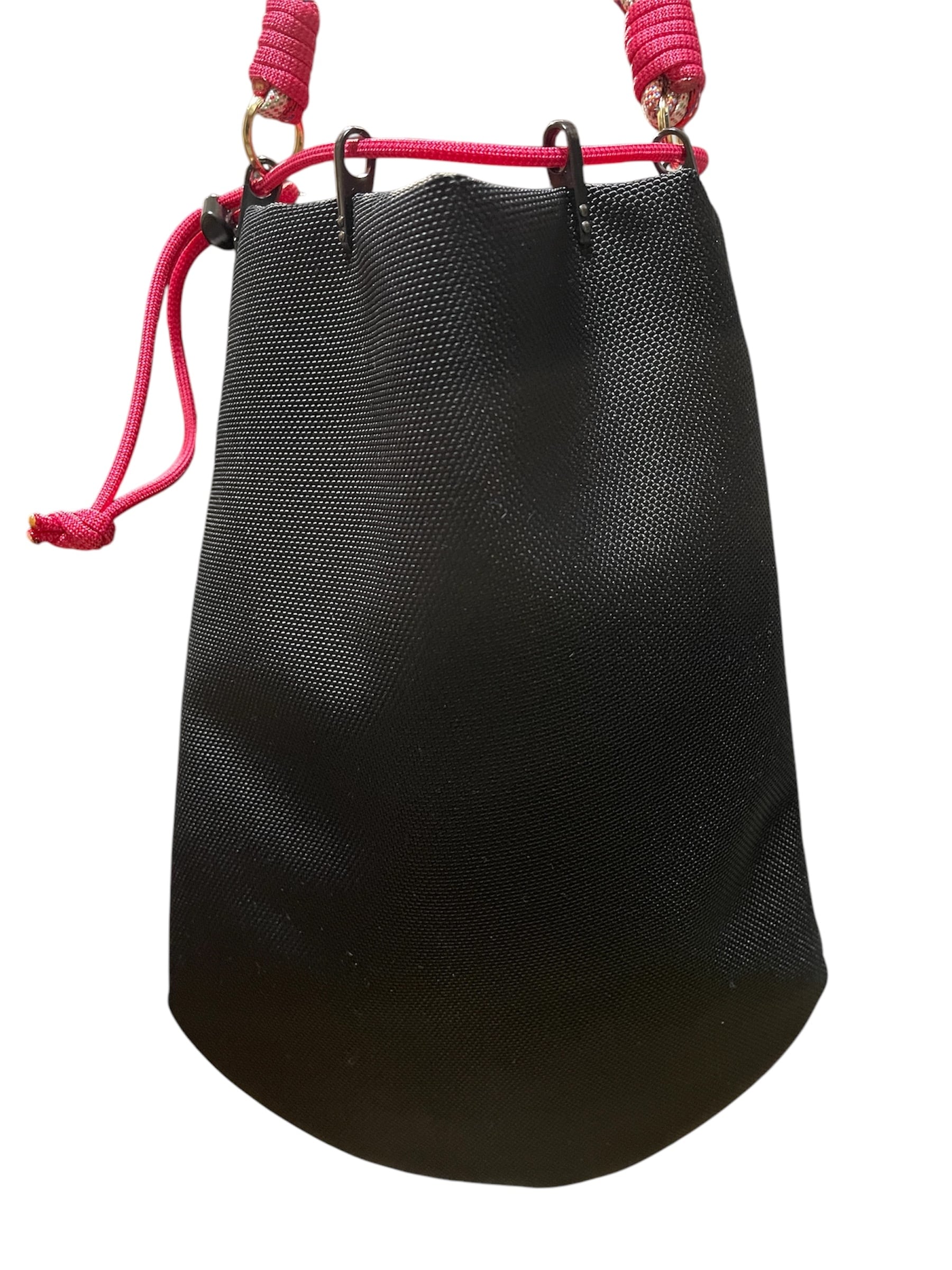 色鮮やかなパラコードを組み上げて作った持ち手を取り付け、手提げスタイルのバッグとしてお楽しみ頂けるスタイルに仕立て上げました。
